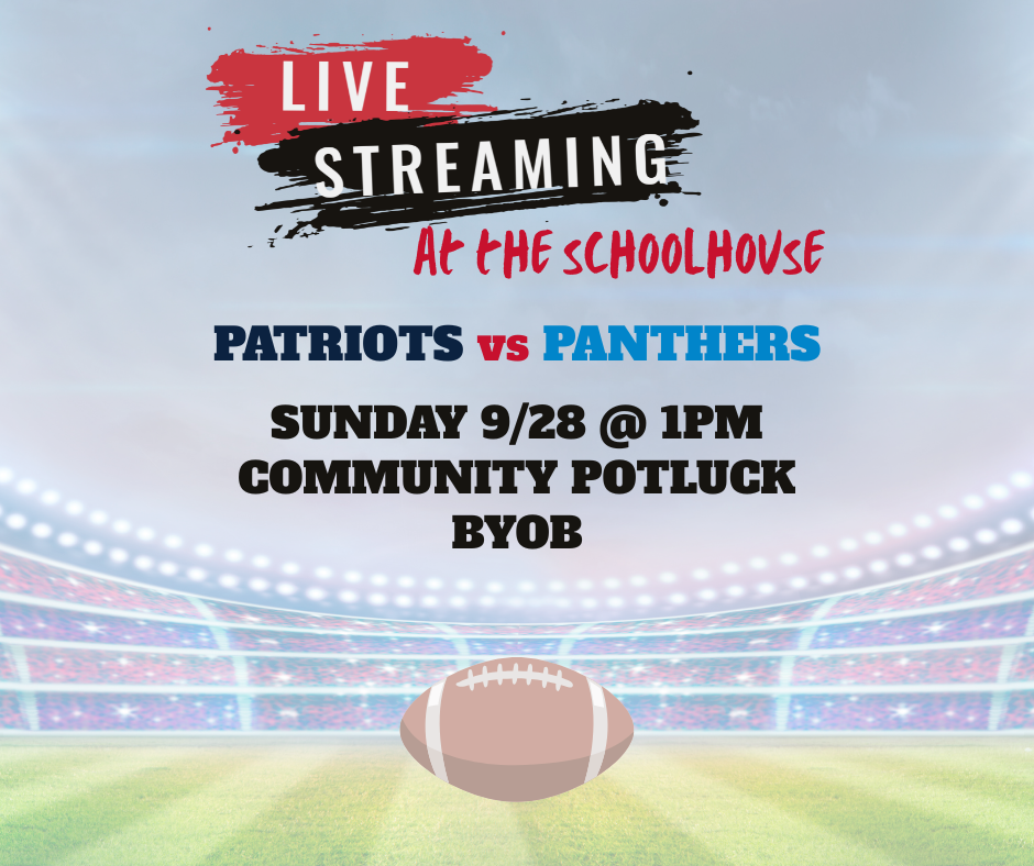 Watch the New England Patriots take on the Carolina Panthers on the big screen. Community potluck begins at 1pm. All are welcome!